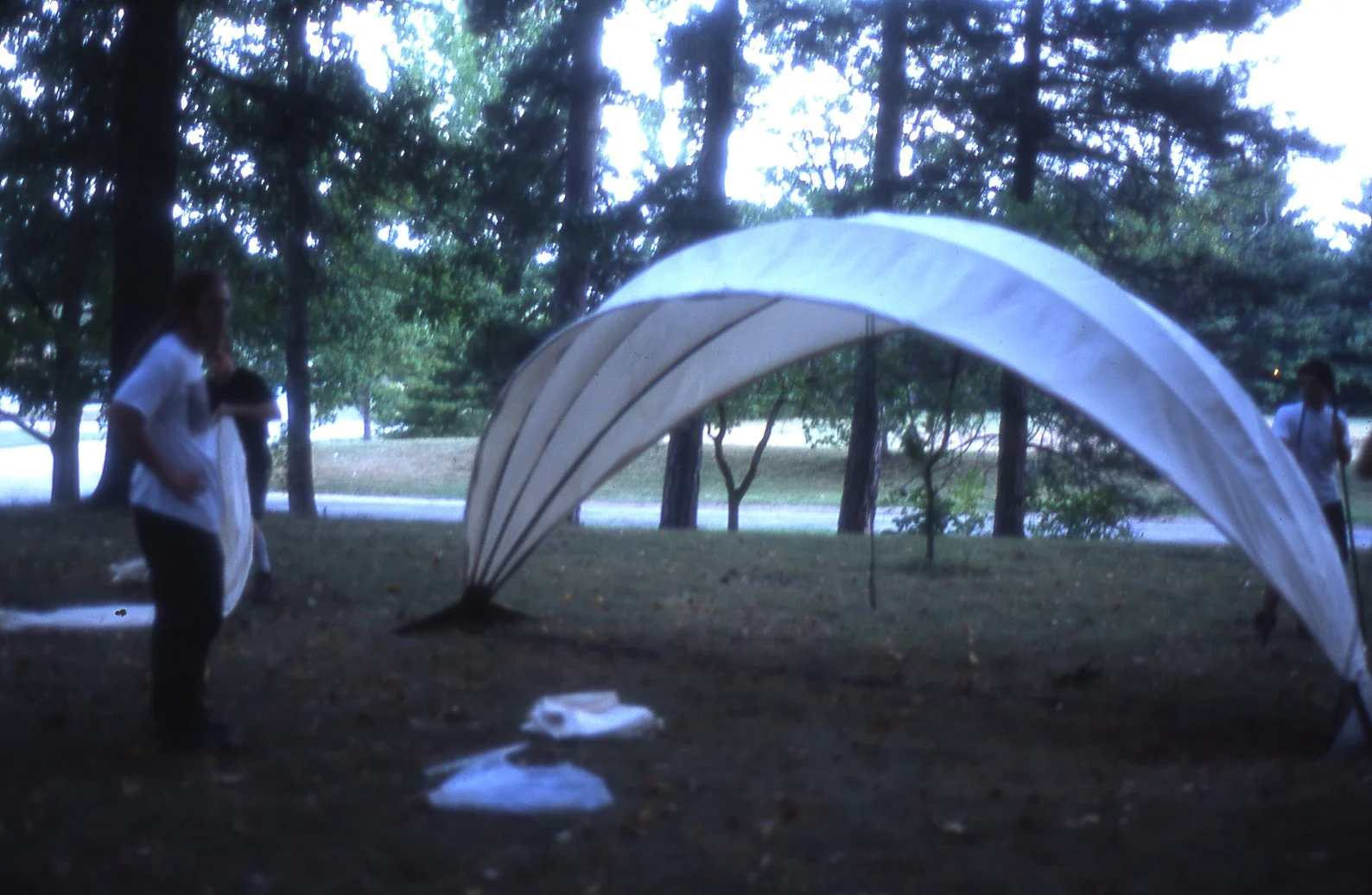 The first major project during our first year in the Sculpture Department at Kansas City Art Institute was to collaboratively design and build portable structures that we collapse and travel across state to St. Louis to set up camp at the Marianist Retreat & Conference Center. The Marianist monk Brother Mel was an early artistic mentor to our instructor, Paul Sebben, which led to us building our Group Habitat Projects there in St. Louis.