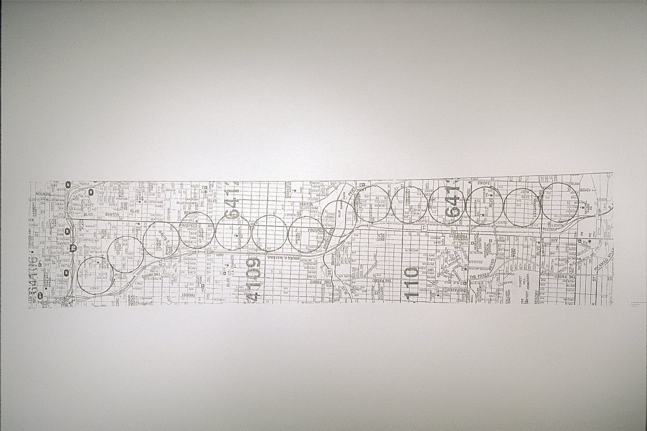 The “other side” of the title refers to the neighborhoods east of U.S. 71, aka Bruce R. Watkins Drive. I went to public school and college in the neighborhoods to the west of the highway, and the gallery displaying the artwork was also located on the west side. A map was made with 14 circles drawn on the east side, each scaled to 1/2 of a mile in diameter. Then I counted all of the discarded tires in each of the 14 areas and made a 1/10th scale stack of tires for each one counted. The stacks of tires were arranged in the gallery according to their location on the map. There were 832 tires counted in a 7 square mile area. Thus 83 tires were in the gallery. The 2’ x 8’ map was pasted to the wall.